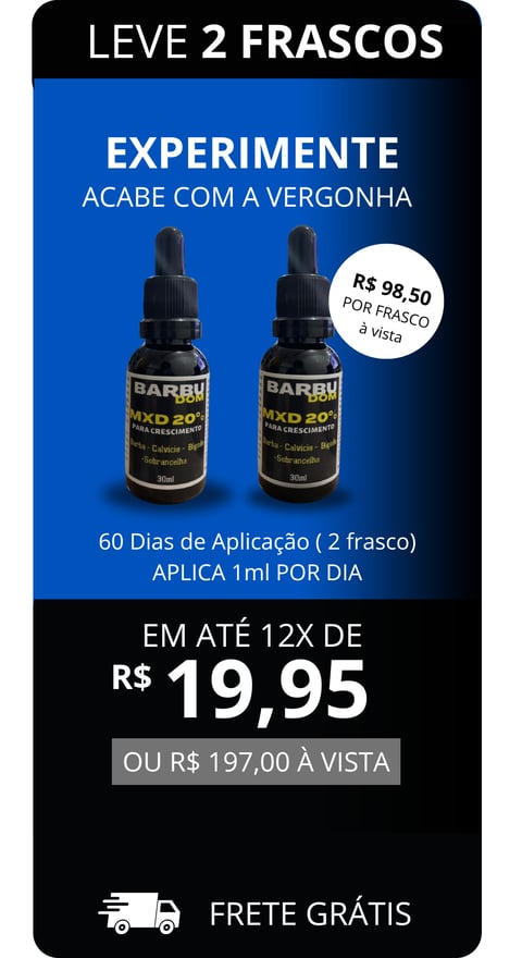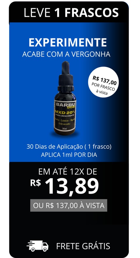 Descubra como o tônico Barbudom MXD 20% pode transformar sua vida, ajudando você a recuperar a confiança e a beleza dos seus cabelos e aumentar sua barba. Os primeiros resultados aparecem a partir da 3ª semana de uso! Diferente de produtos que demoram meses ou nem funcionam, Barbu Dom MXD 20% entrega resultados reais em tempo recorde!